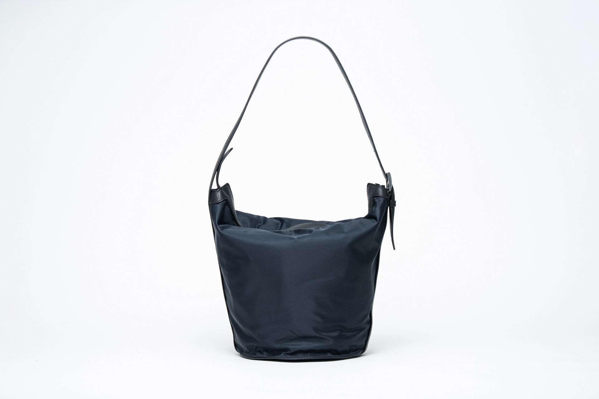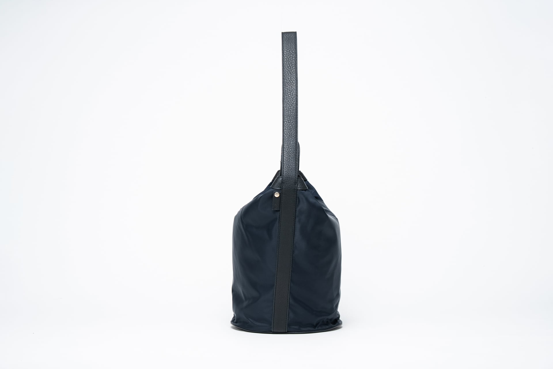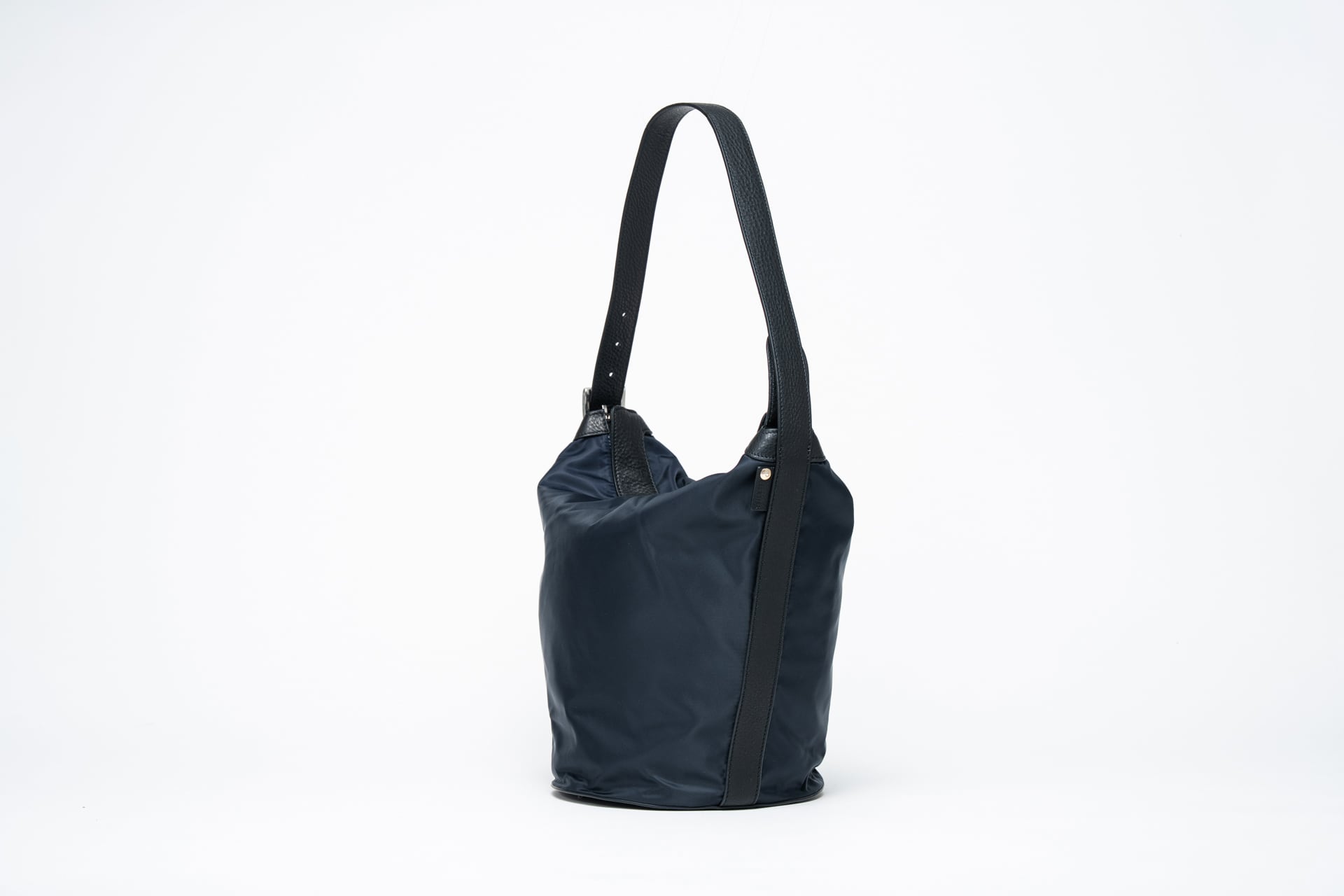 高密度のイタリアンナイロンと天然シボが上品さを感じさせるレザーのコンビネーションにより上品な印象に仕上がったバケツ型ショルダーバッグです。