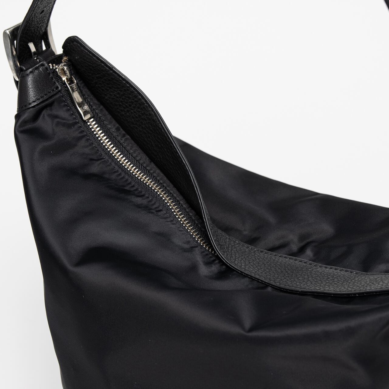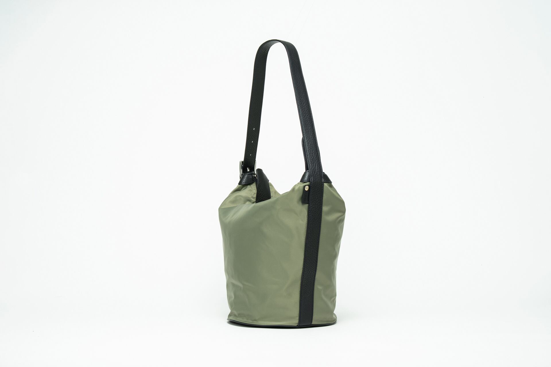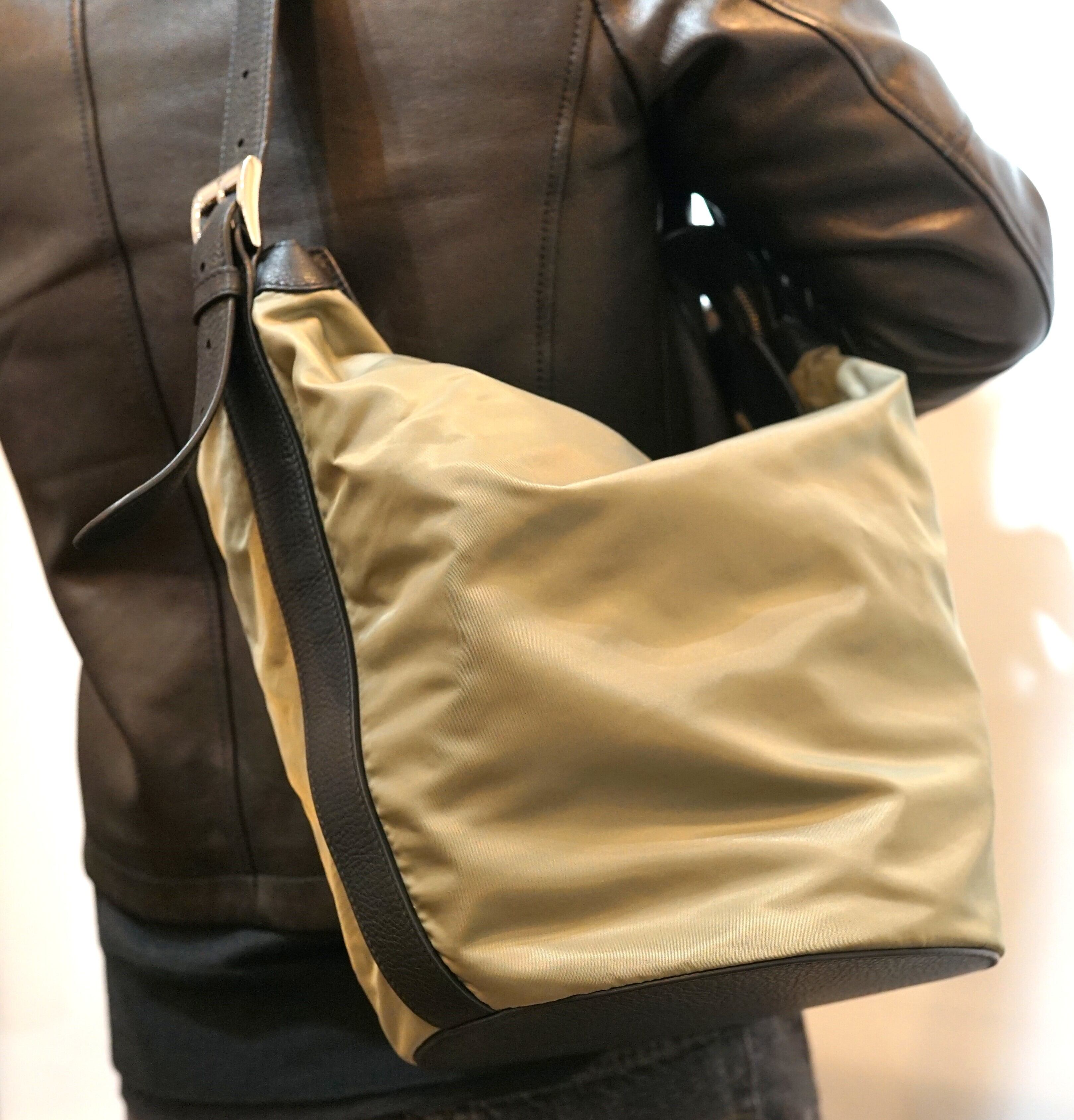 高密度のイタリアンナイロンと天然シボが上品さを感じさせるレザーのコンビネーションにより上品な印象に仕上がったバケツ型ショルダーバッグです。