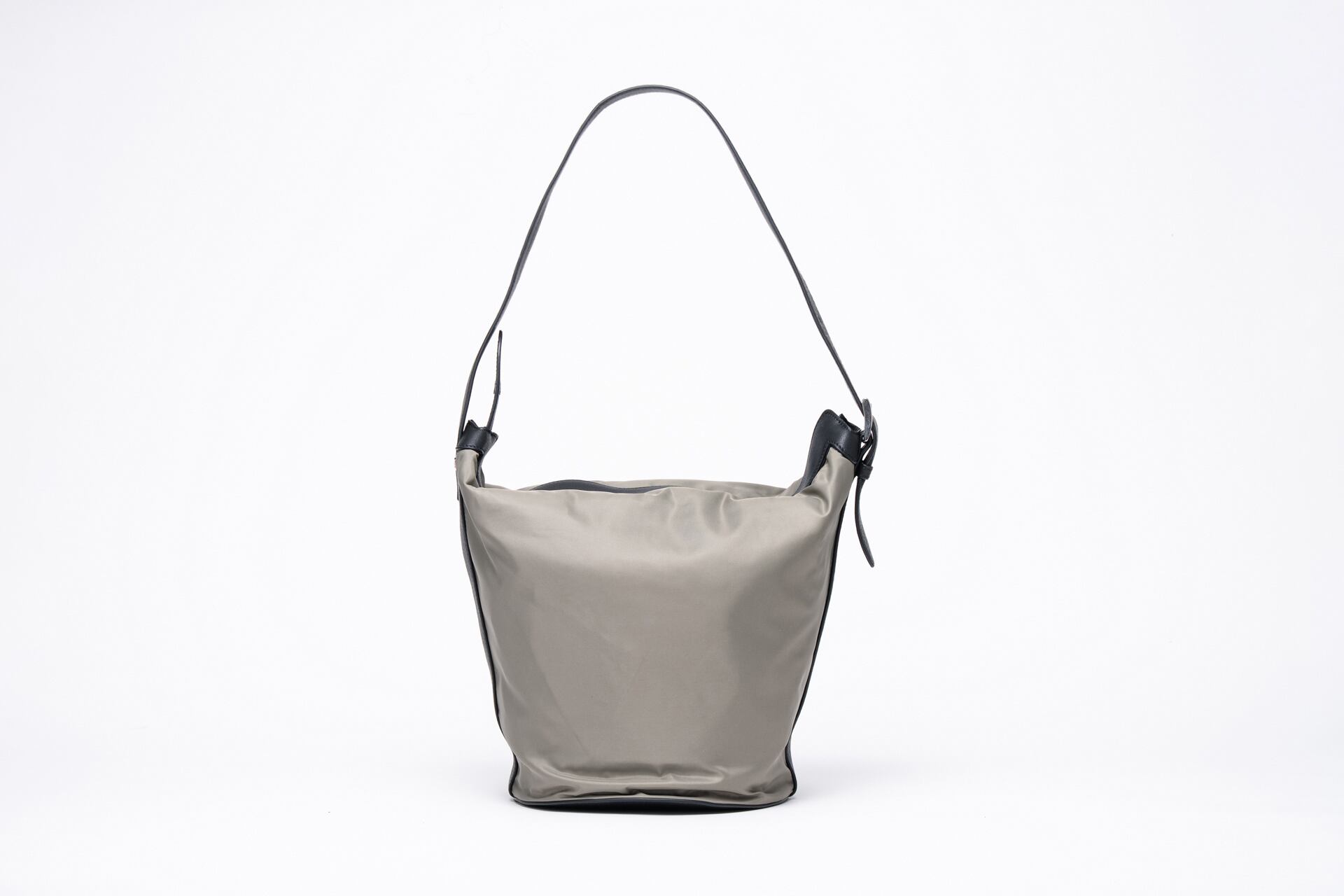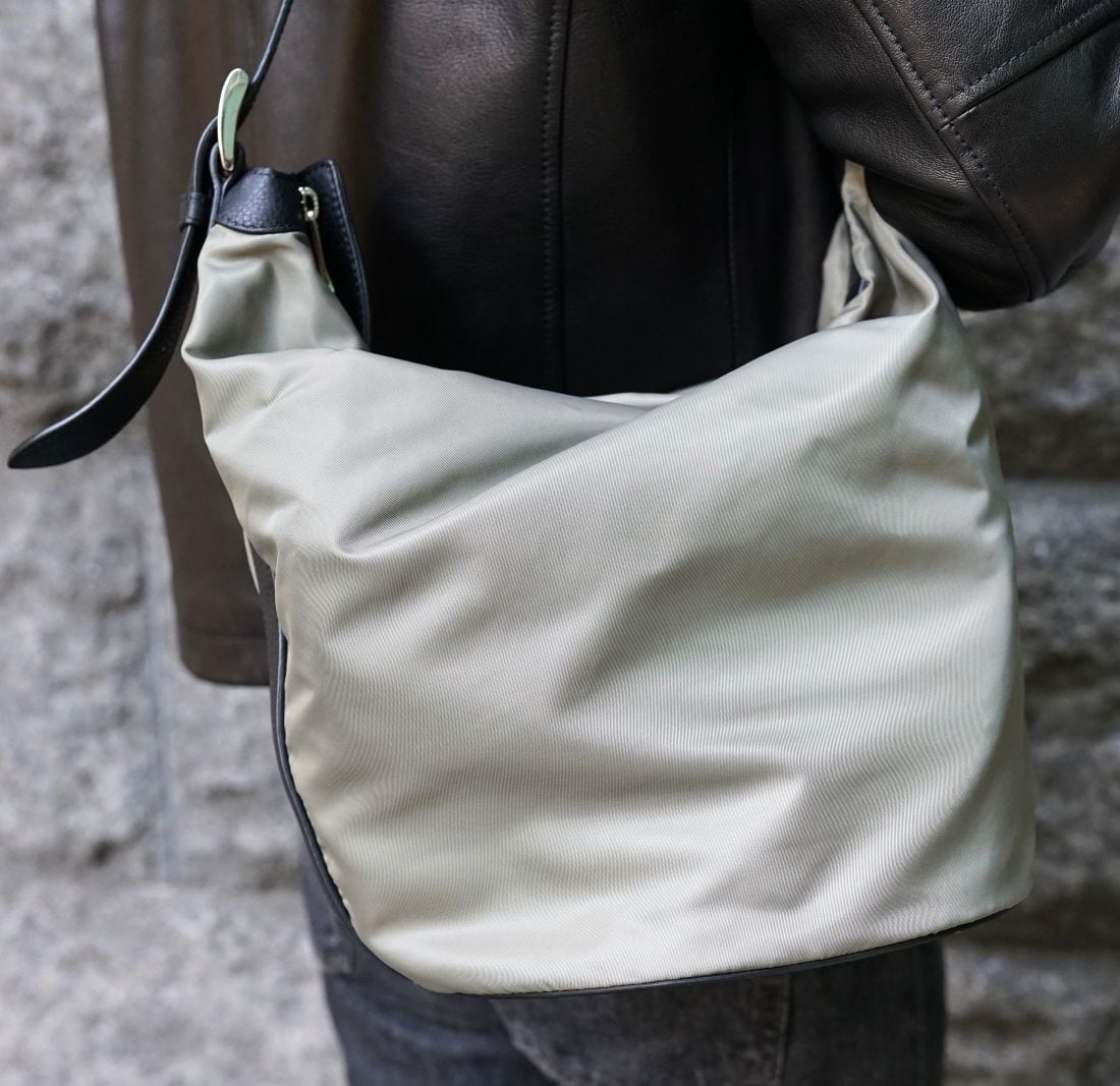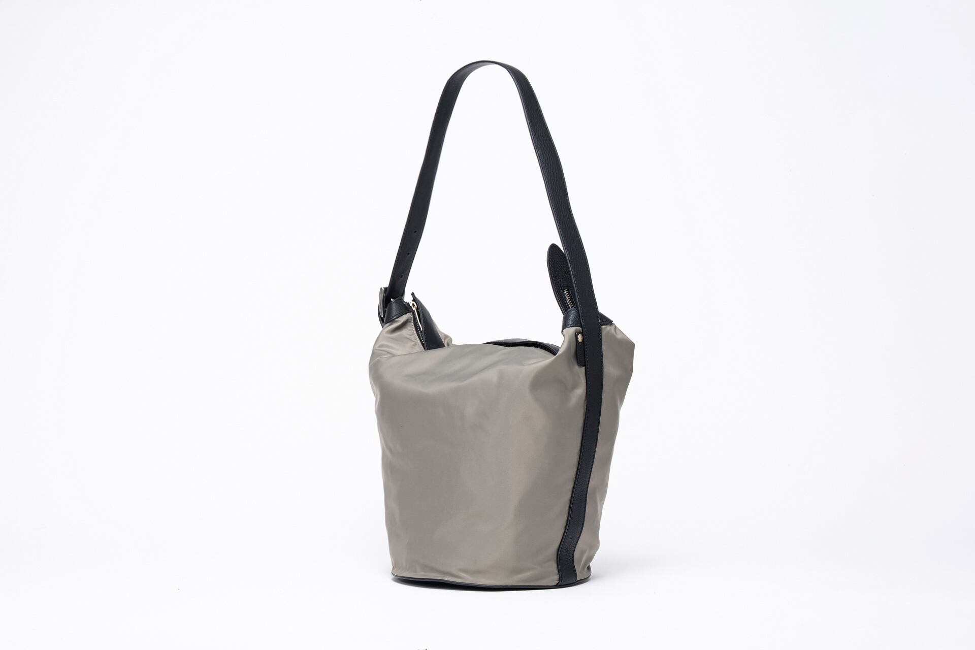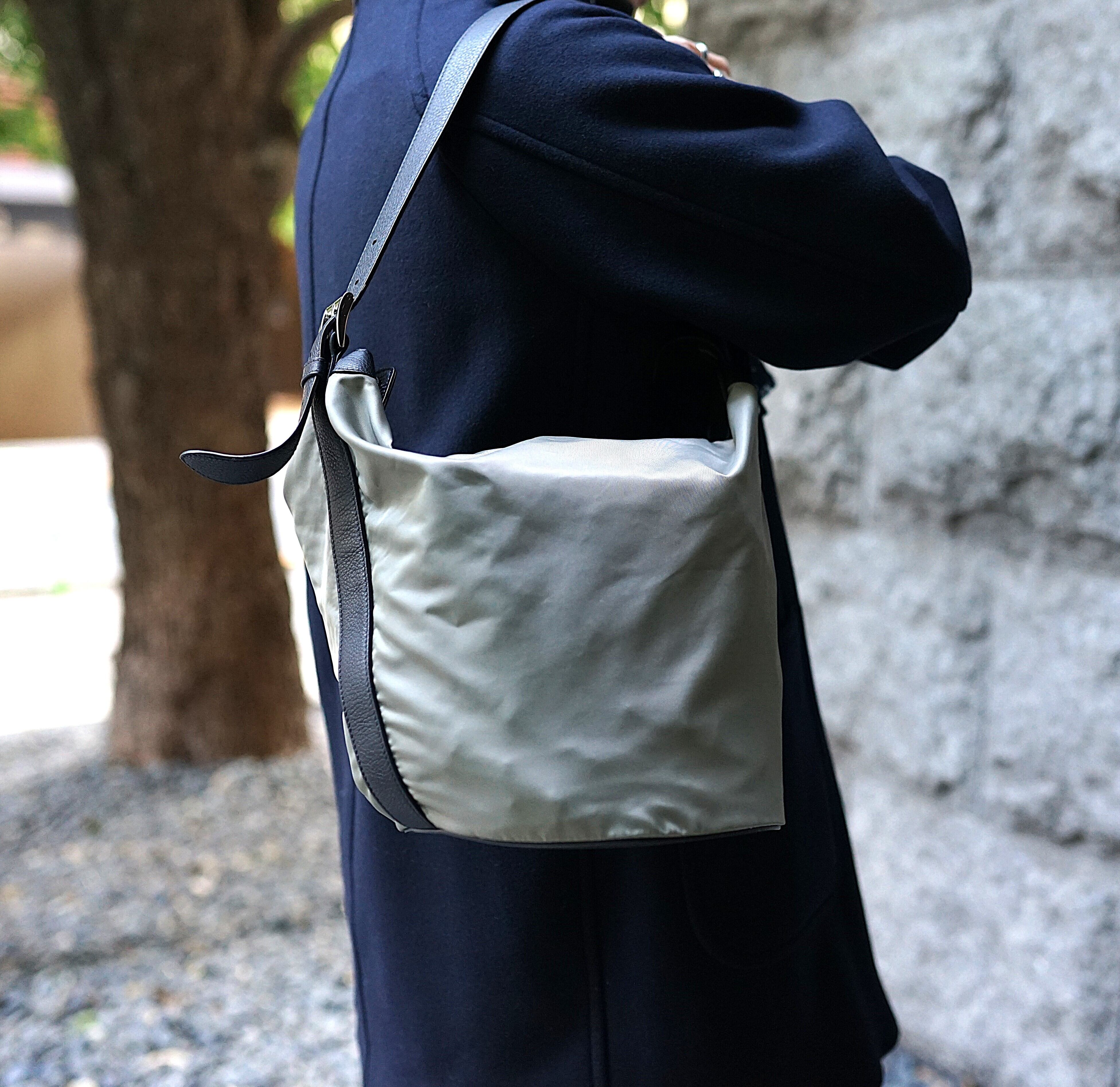 高密度のイタリアンナイロンと天然シボが上品さを感じさせるレザーのコンビネーションにより上品な印象に仕上がったバケツ型ショルダーバッグです。