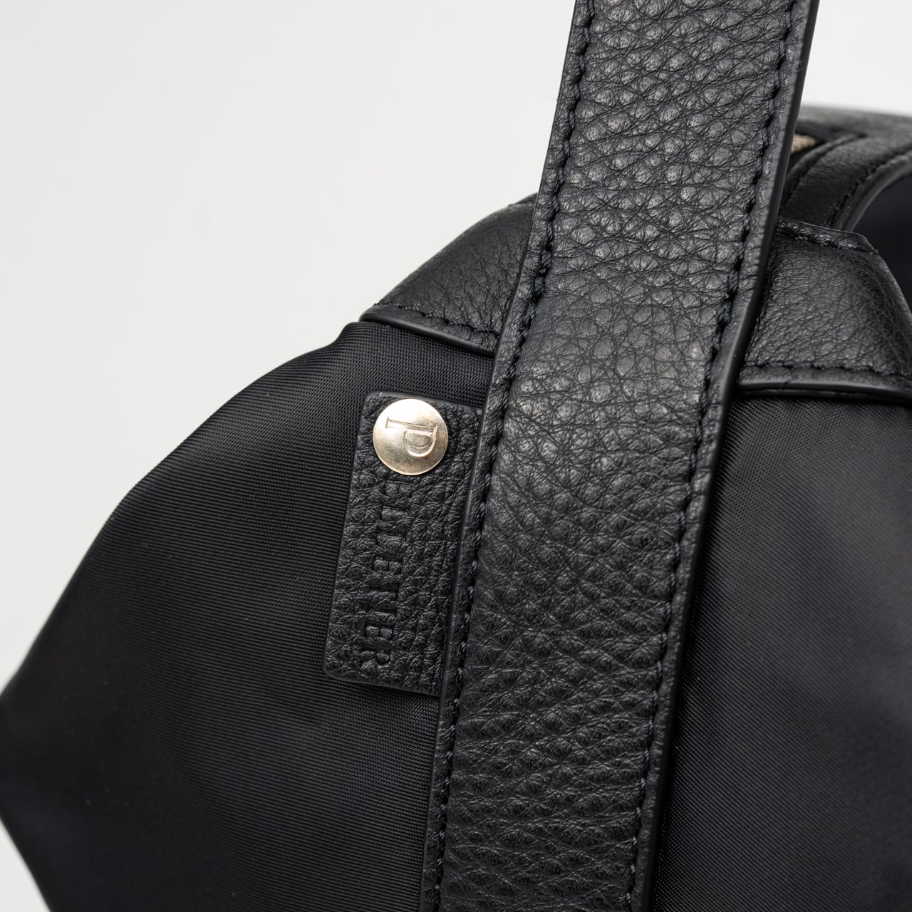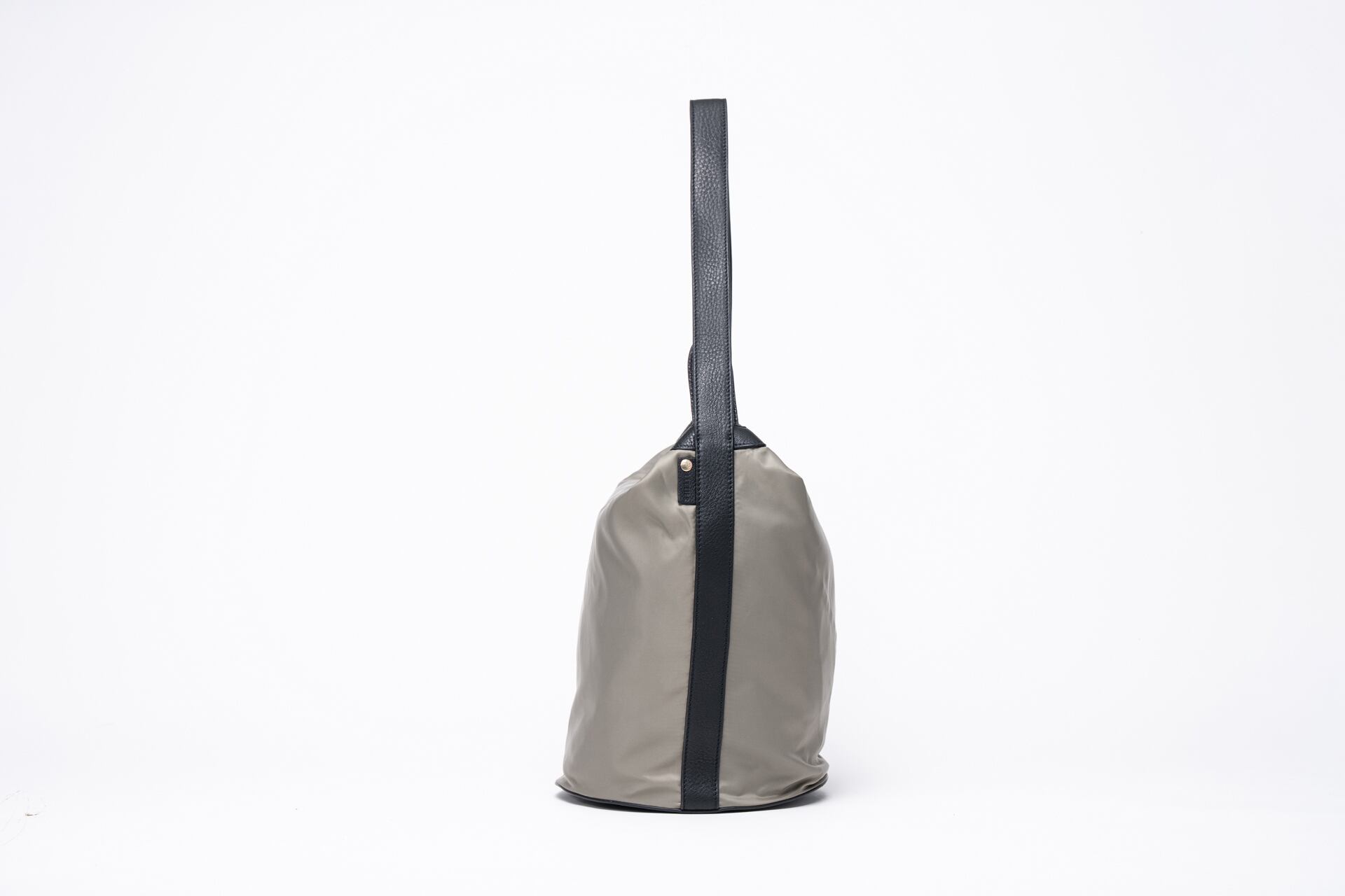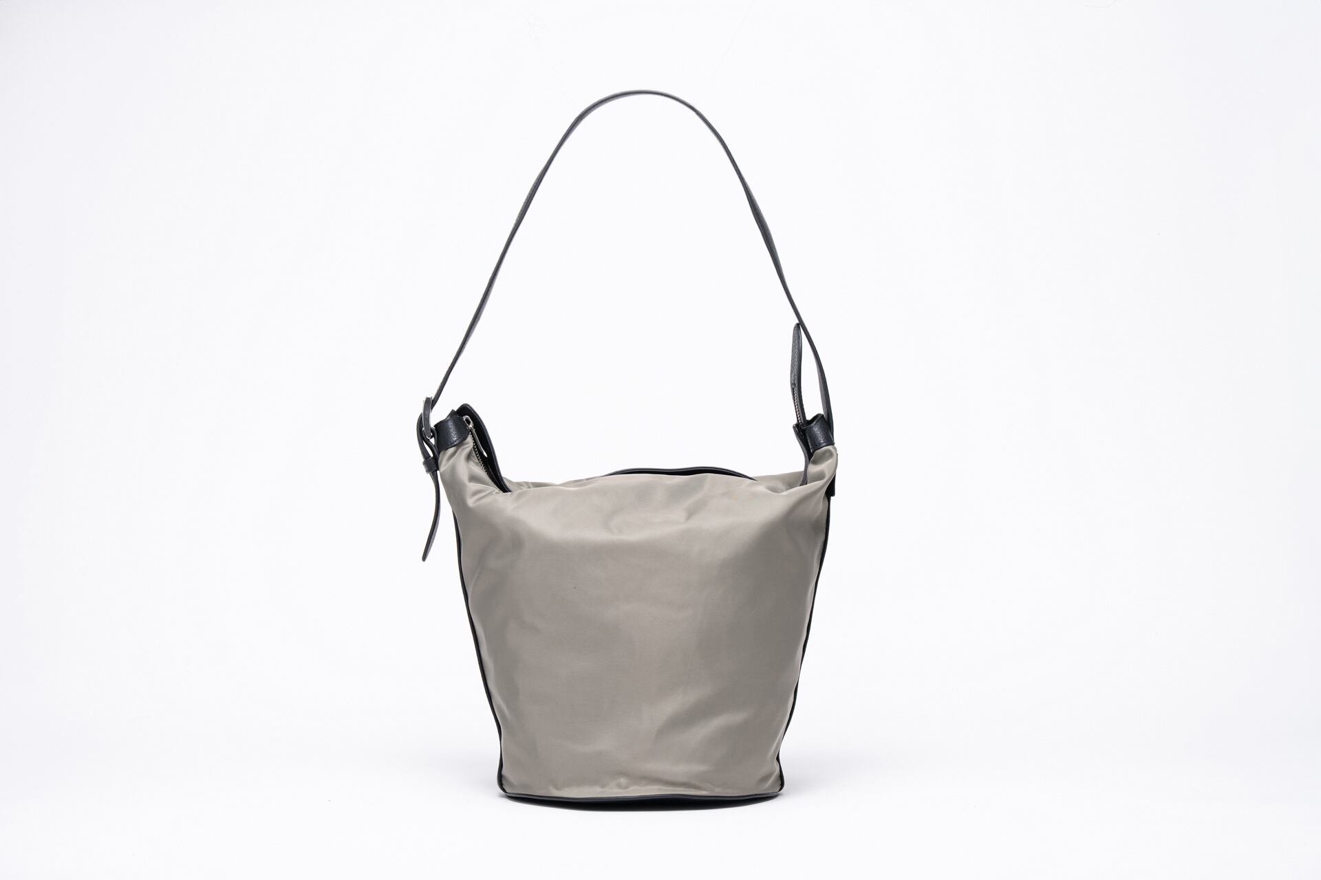 高密度のイタリアンナイロンと天然シボが上品さを感じさせるレザーのコンビネーションにより上品な印象に仕上がったバケツ型ショルダーバッグです。